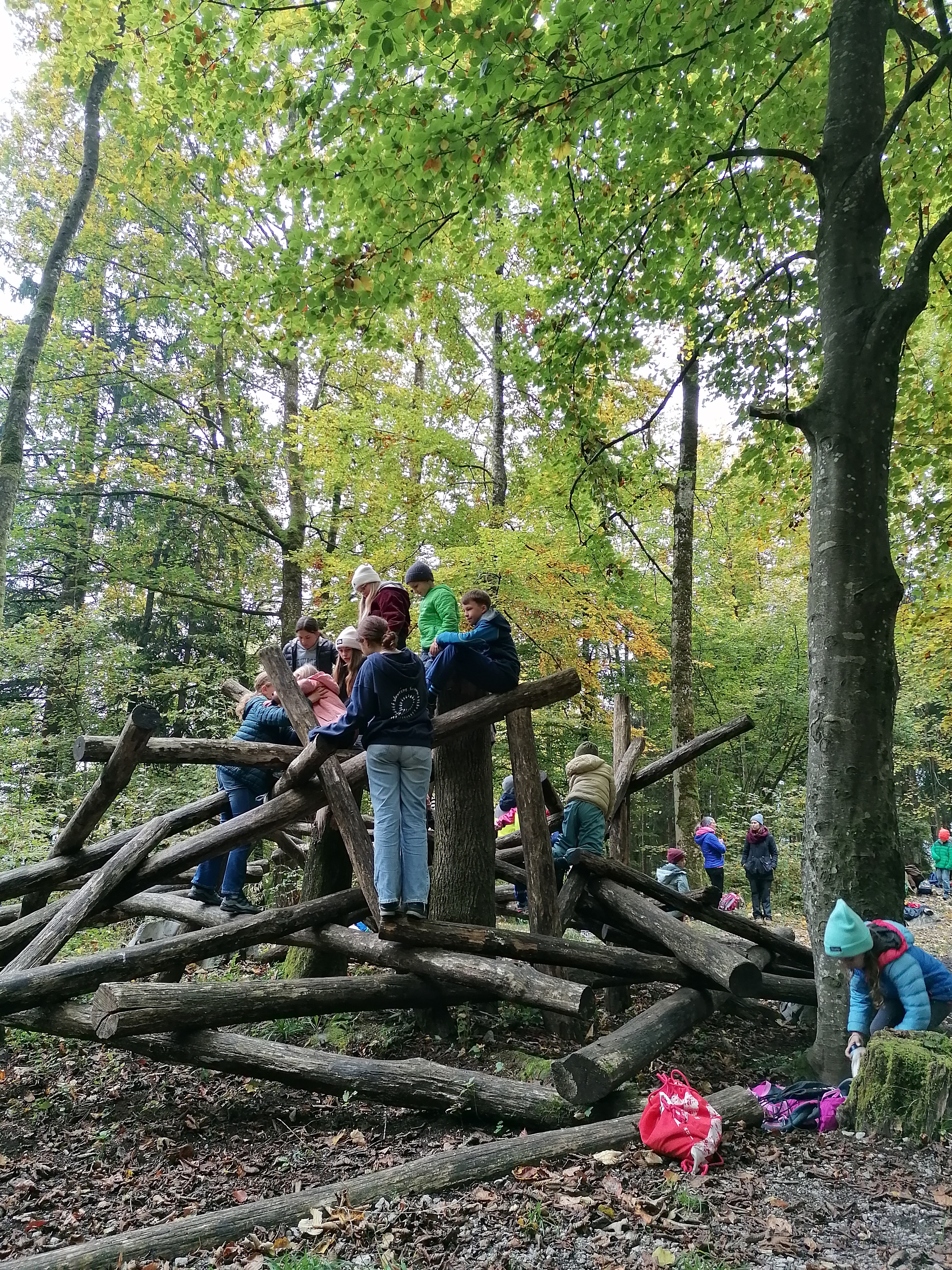 Unseren Prima-Klima-Morgen starteten wir mit dem Priklisong – eine musikalische Erinnerung daran, dass wir Rücksicht aufeinander nehmen, ein super Team sind und Gross und Klein gemeinsam Plausch haben. Anschliessend marschierten wir in klassendurchmischten Gruppen auf unterschiedlichen Wegen zum nahen Sytiwald – der trotz des Hochnebels in einer herbstlich goldenen Farbenpracht strahlte.