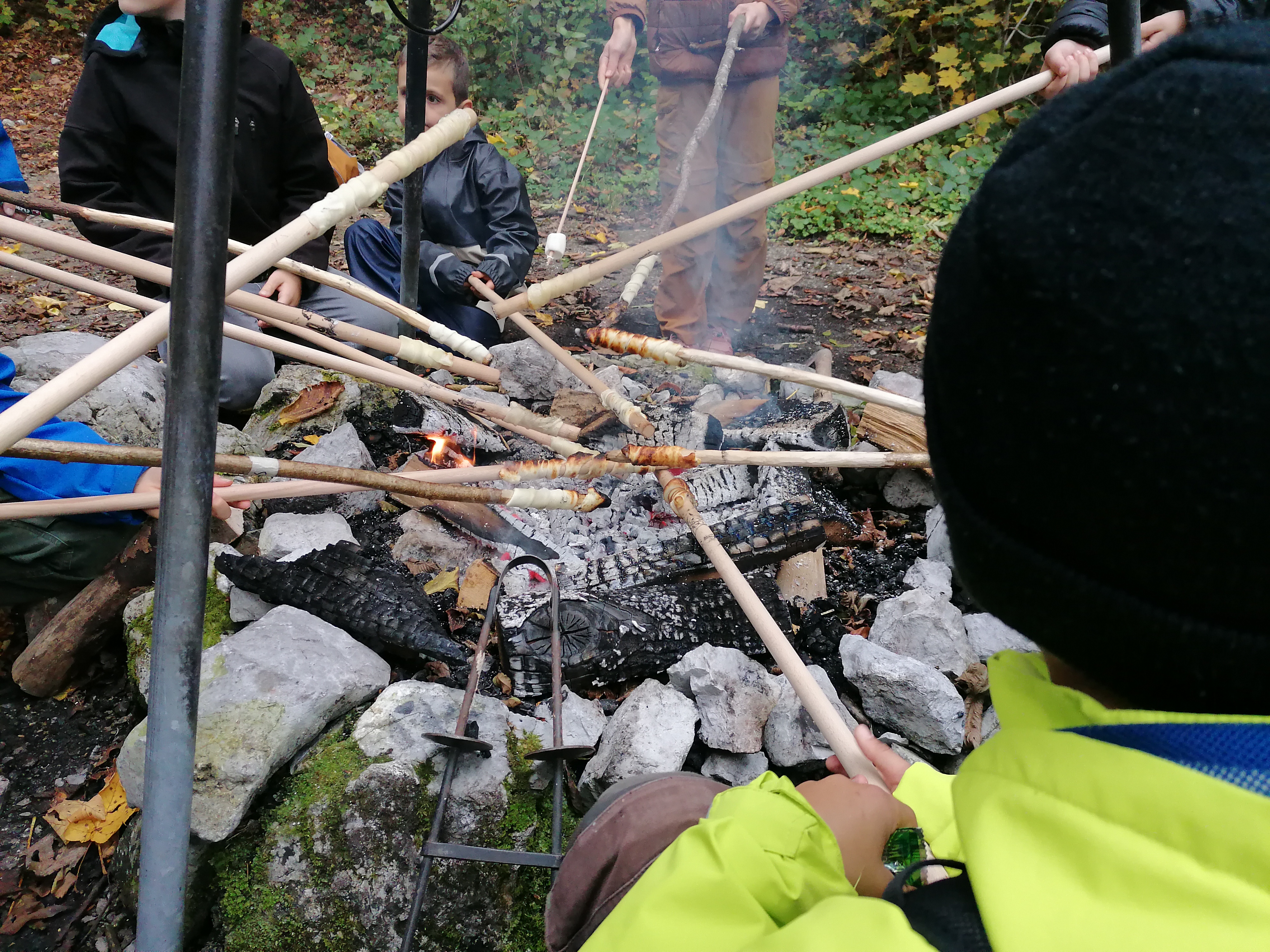 Durch die erfolgreiche Zusammenarbeit erhielten die Kids Codes, welche sie zur Entschlüsselung der Schatzkisten am Zielort brauchten. Glücklicherweise konnten alle Spiele gelöst und die richtigen Zahlenkombinationen geknackt werden: In den Schatzkisten war ein leckeres Znüni, welches wir mit Freude über dem knisternden Lagerfeuer zubereiteten: Schuggistängeli im Blätterteigmantel und Marshmallow-Sandwich. Die Kids hatten aber auch viel Zeit, um sich im Wald kreativ auszutoben, zu spielen und Gemeinschaft zu pflegen. Und weil wir schliesslich Ehrenmänner und Ehrenfrauen sind, gehörte das abschliessende «Fötzälä» des Grillplatzes natürlich auch dazu.