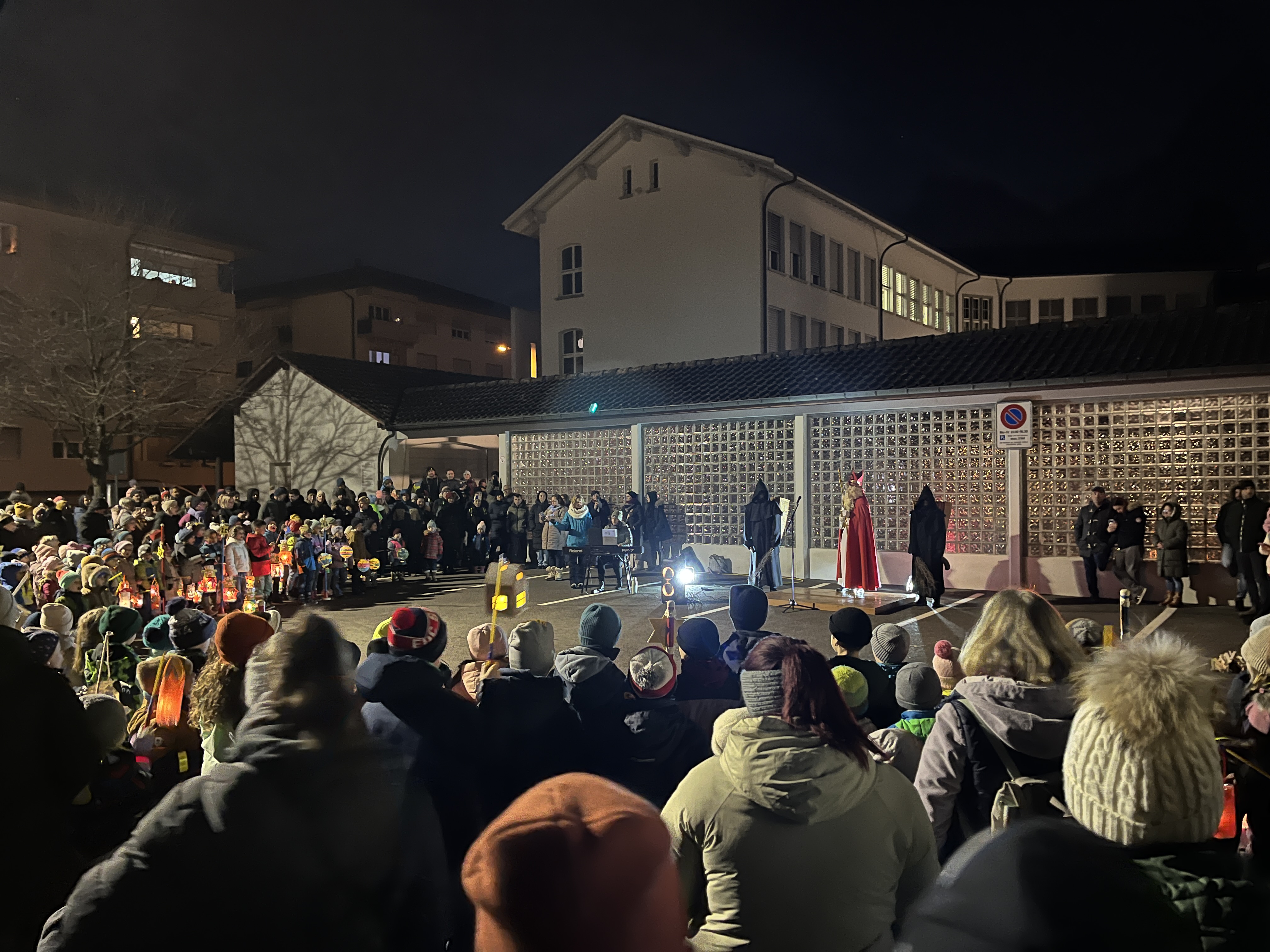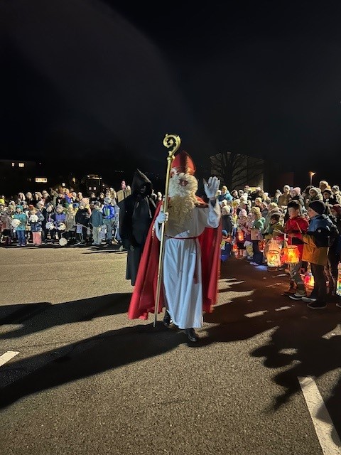 Ein besonderer Höhepunkt: Bei der Brücke vor der Kirche holten wir den Samichlaus und seine Schmutzlis ab, die dann gemeinsam mit uns zum Schulhausplatz begleitet wurden. Unterwegs sangen die Kinder das Begrüssungslied „Willkomme liebe Samichlaus…“ für den Samichlaus, der die Laternen bewunderte und die Kinder freundlich grüsste.
